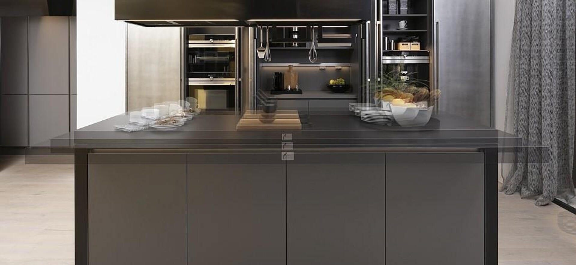 Was für eine wundervolle Idee: Der Küchenblock mit Kochfeld und Spülbecken wird komplett mit einer zweiten Arbeitsplatte, der Flying Bridge, abgedeckt. Diese kann man einfach nach vorn in den Raum schieben. Im Nu entsteht eine Theke für Zaungäste und Topfgucker, und der Weg zur eigentlichen Kochinsel ist frei. Ziemlich genial, oder?