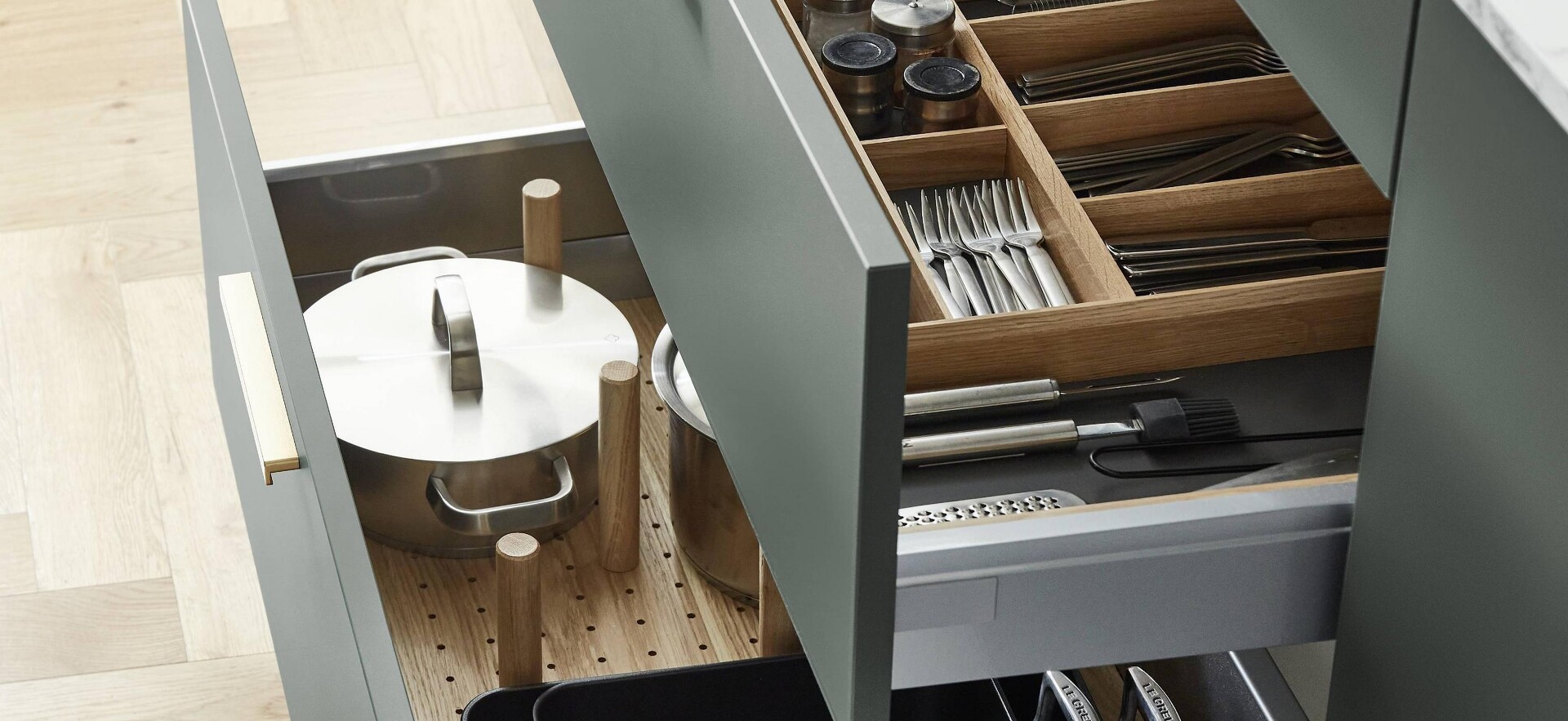 Küchen-Unterschränke mit Auszügen sind um einiges praktischer als Unterschränke mit Türen. Sie lassen sich müheloser öffnen, und man hat gleich viel besseren Überblick und Zugriff auf den Inhalt. Je nachdem, was Sie hier unterbringen möchten, gibt es passende Aufteilungssysteme für die Innenorganisation.