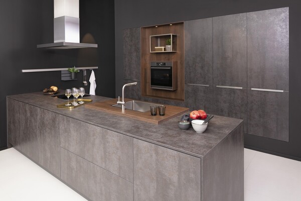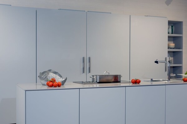 Der Samtmatteffekt bei Küchenmöbelfronten wird durch ein besonderes Silikatmineral im Lack erreicht, das durch seine Porosität das einfallende Licht „schluckt“ und deshalb matt und samtig wirkt. Manchmal werden diese Oberflächen auch „pelle di pesca“ (= Pfirsichhaut) genannt. Die Porosität macht diese Oberfläche gegen stark gefärbte Flüssigkeiten wie z.B. Johannisbeersaft, Tomatenketchup oder Rotwein, aber auch Fettspritzer empfindlich. Hier gilt ganz besonders, dass umgehend gereinigt werden muss. Ist der Fleck erst einmal eingetrocknet, kann er meist nicht mehr vollständig entfernt werden. Man kann zwar versuchen, Flecken mit einer weichen Bürste und einem milden Haushaltsreiniger zu behandeln, aber meist ohne großen Erfolg. Mit aggressiveren Mitteln oder Scheuermittel wird die Oberfläche aufpoliert und es entsteht ein hässlicher Glanzfleck.